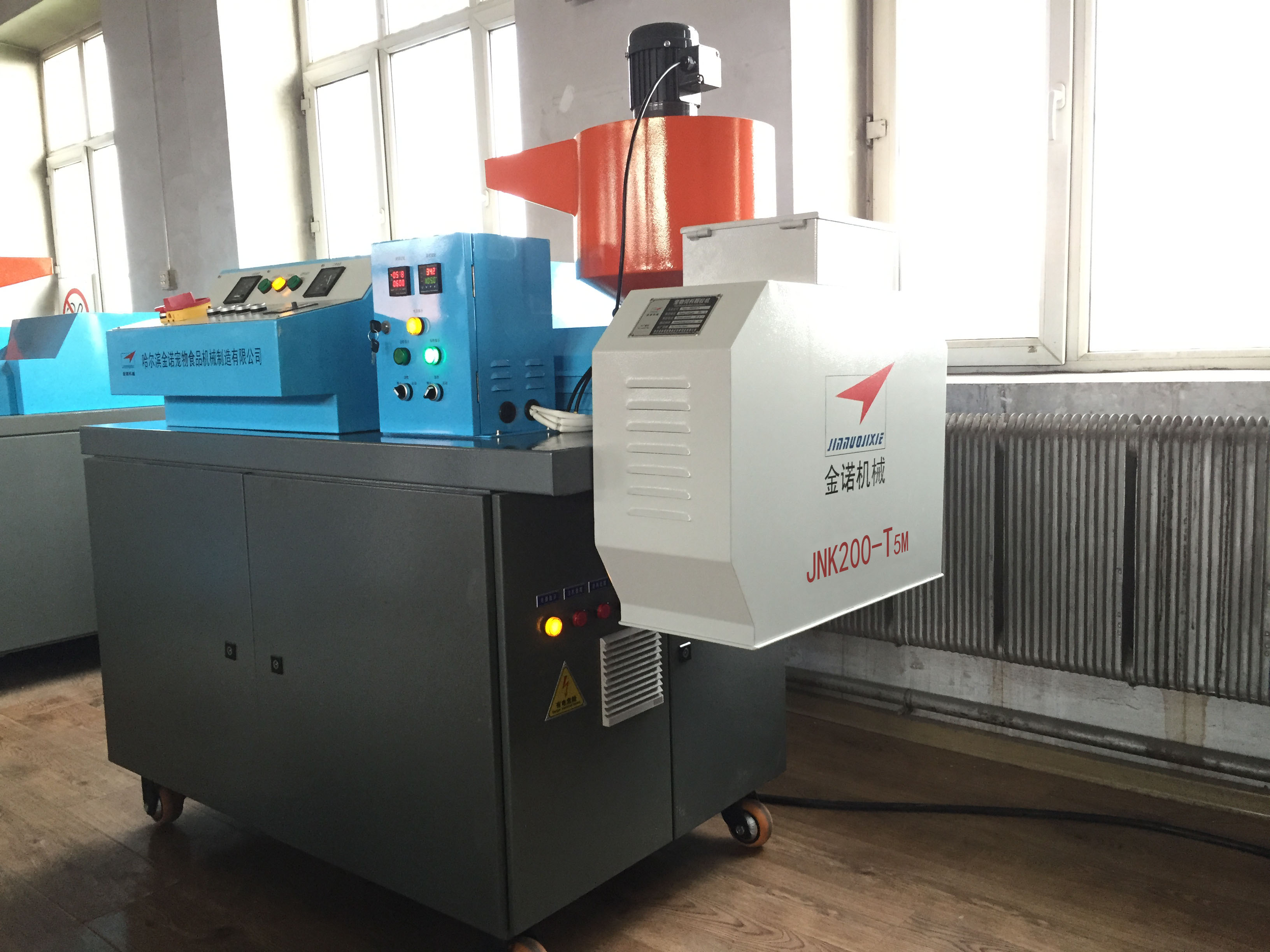 狗糧加工設(shè)備JNK200-T5M:1。JNK200-T5M型狗糧加工設(shè)備安裝方便、出廠已經(jīng)試機(jī),狗糧機(jī)切刀采用直角切刀技術(shù),調(diào)試簡單;2。狗糧設(shè)備的主軸和切刀小軸均可隨時(shí)注入耐高溫潤滑脂,延長狗糧機(jī)的軸承使用壽命;3。JNK200-T5M狗糧設(shè)備每小時(shí)生產(chǎn)狗糧顆粒200公斤。